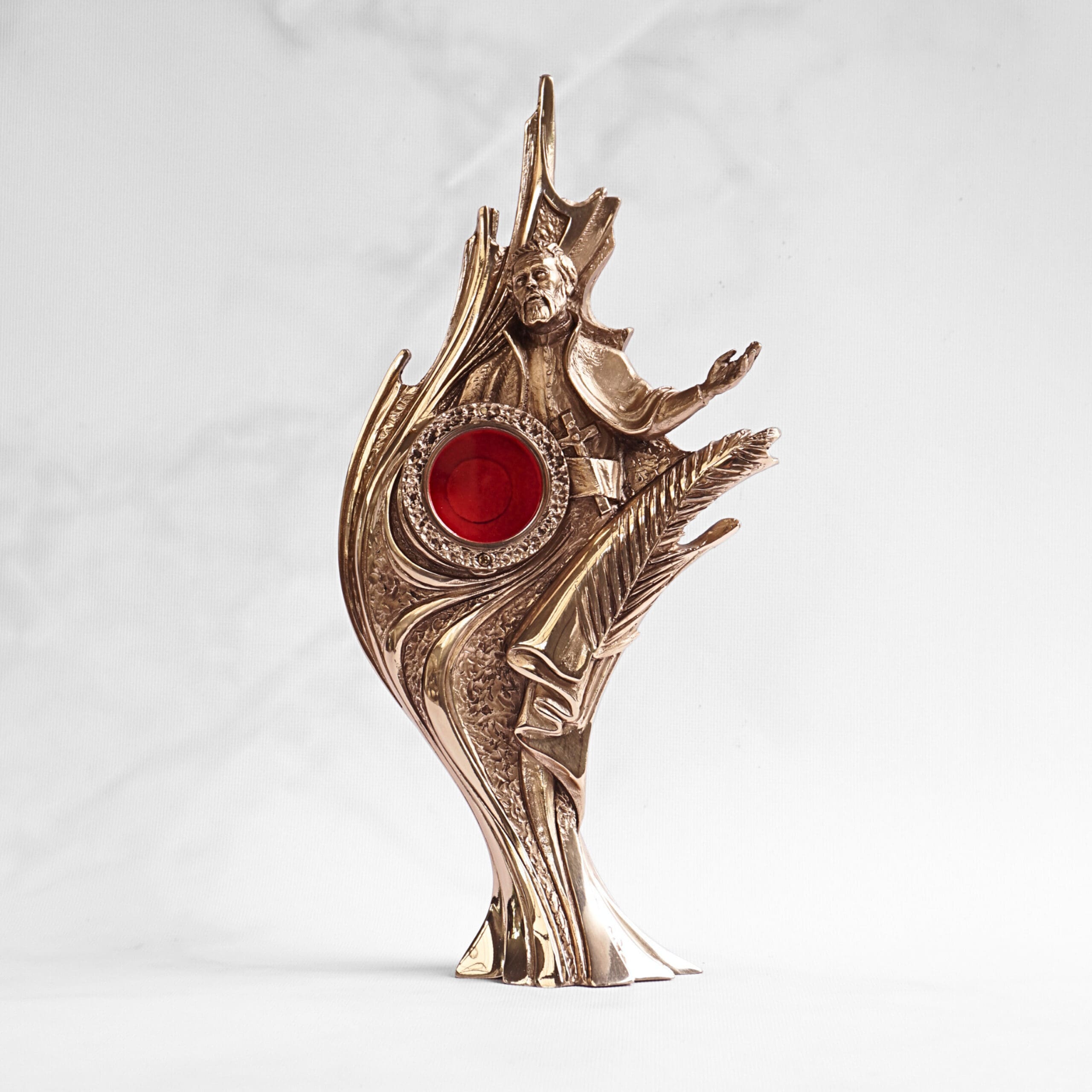 Święty Andrzej Bobola to patron Polski. Na relikwiarzu ze szczególną starannością odwzorowaliśmy oczy świętego, które wpatrzone są w niebo. Ubrany jest w jezuicką sutannę z szerokim pasem. Za pasem zatknięty ma krzyż misyjny. Na relikwiarzu umieściliśmy liść palmy- symbol męczeńskiej śmierci Andrzeja Boboli. Oczko na relikwie znajduje się na wysokości serca świętego.